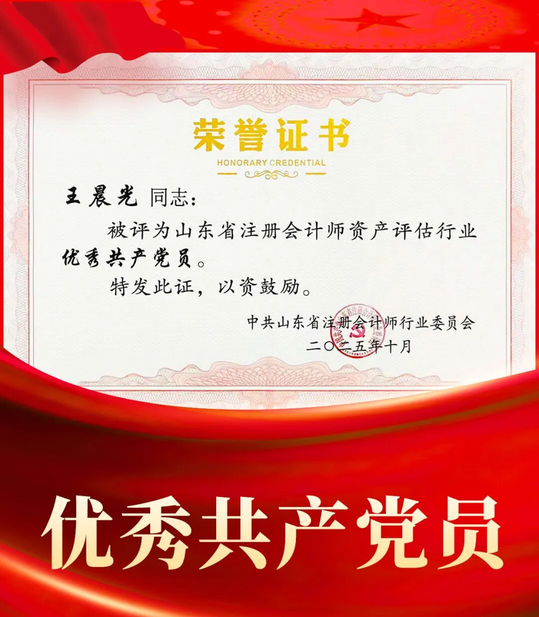 | 喜报|祝贺王晨光同志荣获山东省注册会计师资产评估行业“优秀共产党员”称号 |